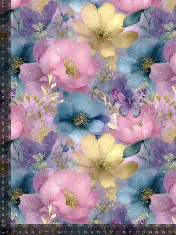 Bomuldsjersey med forårsblomster og sommerfugle